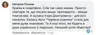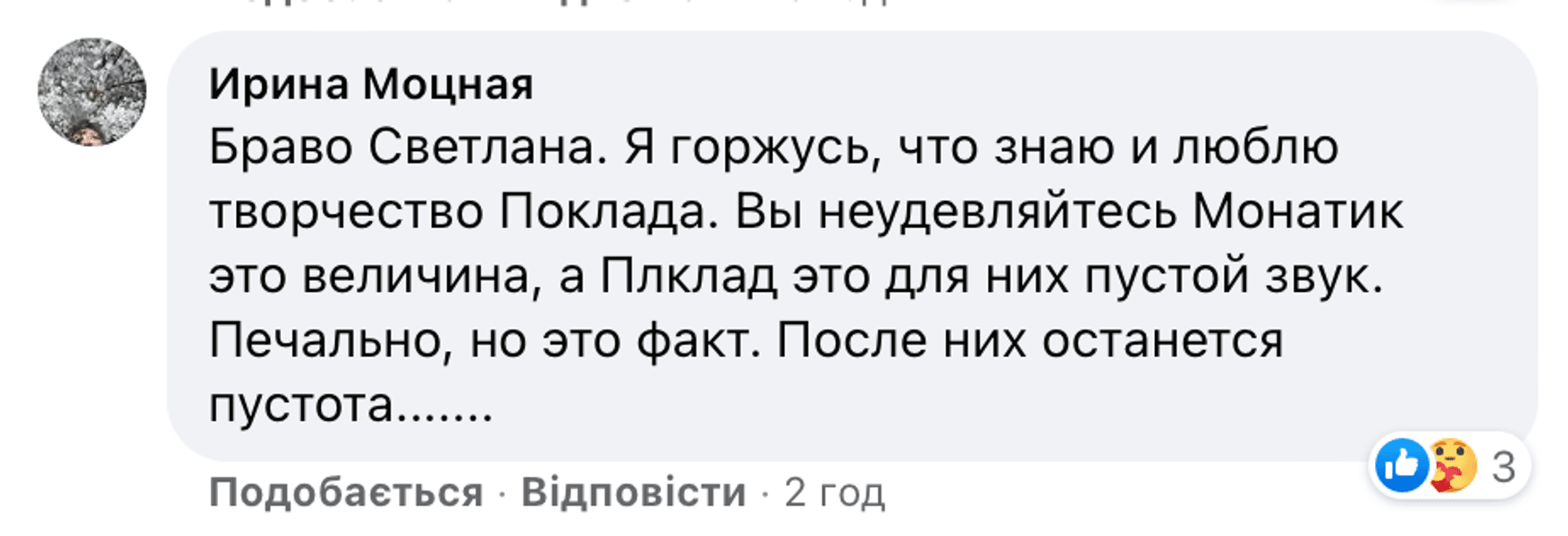 "Браво, Світлано. Я пишаюся, що знаю і люблю творчість Поклада. Ви не дивуйтесь Монатик це величина, а Поклад це для них порожній звук. Сумно, але це факт. Після них залишиться порожнеча……." — відреагувала на допис Світлани інша користувачка Facebook.