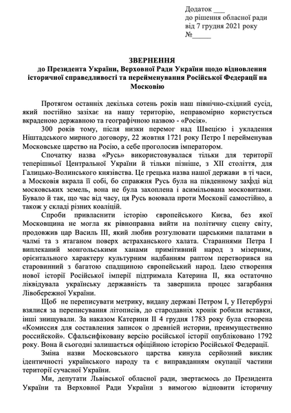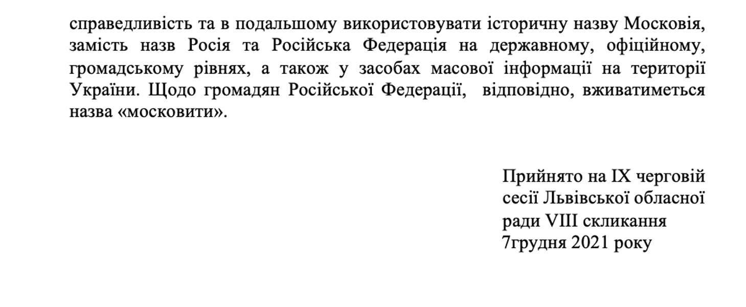 "Ми, депутати Львівської обласної ради, звертаємось до Президента України та Верховної Ради України з вимогою відновити історичну справедливість і надалі використати історичну назву Московія замість назв Росія та Російська Федерація на державному, офіційному, громадському рівнях, а також у засобах масової інформації на території Україна стосовно громадян Російської Федерації, відповідно, використовуватиметься назва "московити", — сказано в документі.