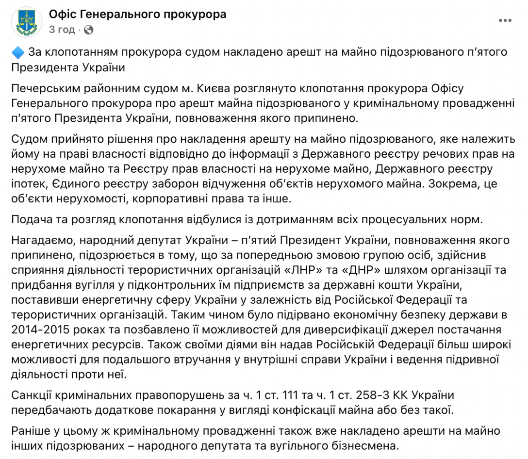 Офіс генпрокурора заявив, що майно Порошенка, на яке сьогодні суд наклав арешт, належить п'ятому президентові і про це свідчить інформація з: