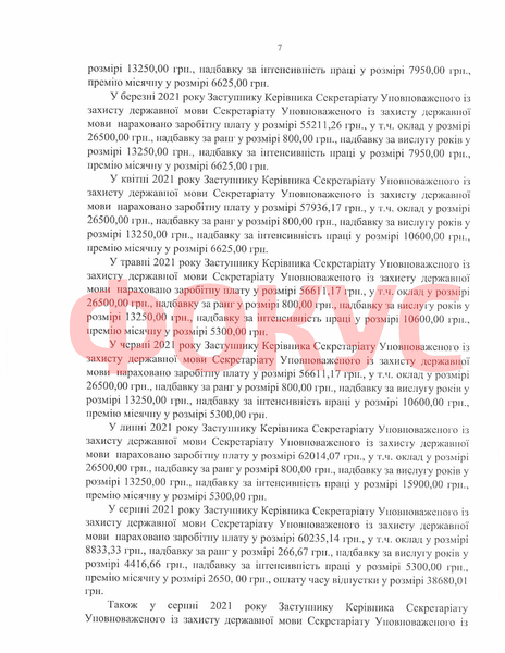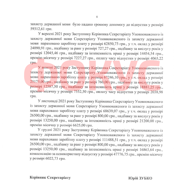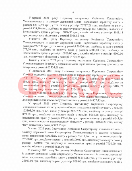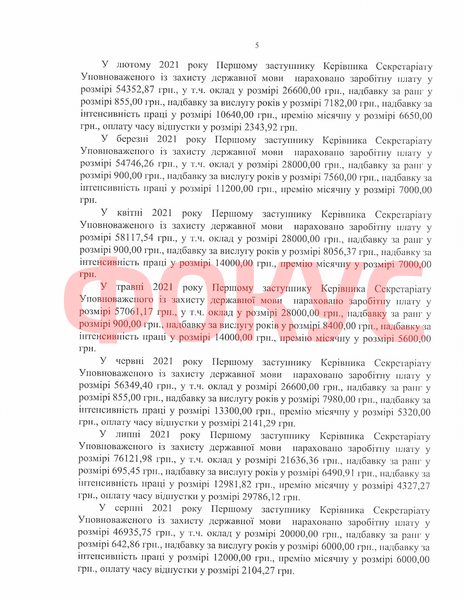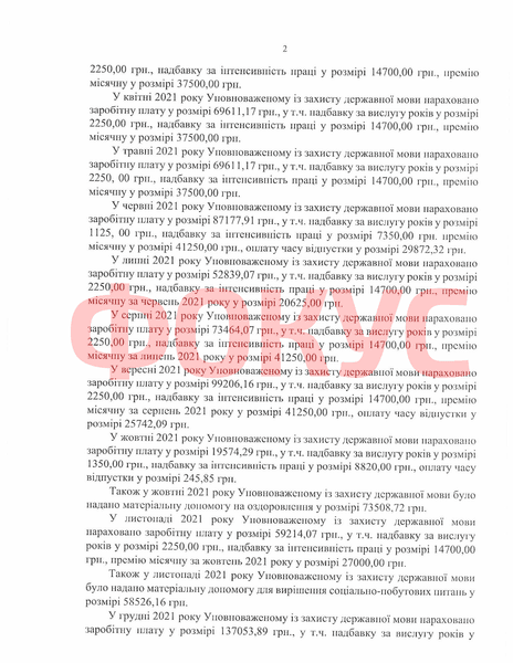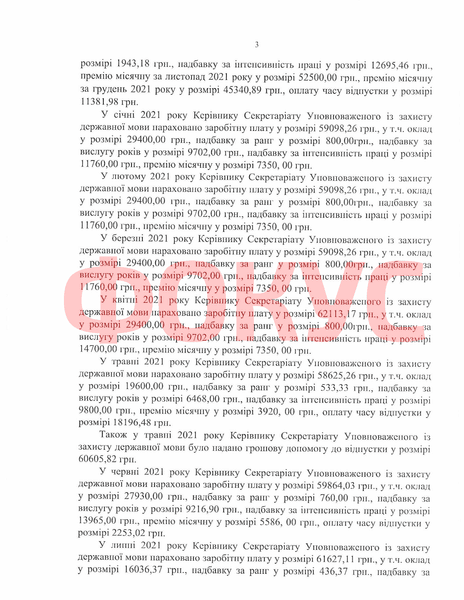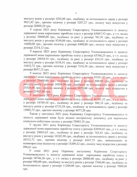 У Секретаріаті уповноваженого із захисту державної мови повідомили Фокусу, що чиновник практично щомісяця отримував "надбавки за інтенсивність праці" в розмірі 98% від окладу.