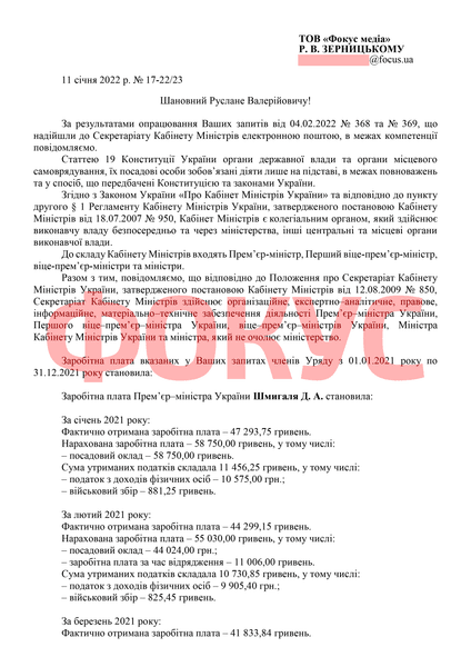 Місячна зарплата прем'єр-міністра України Дениса Шмигаля у 2021 році варіювалася від 41,8 тис. грн. до 57,2 тис. грн. з вирахуванням податків. Про це йдеться у відповіді Секретаріату Кабінету Міністрів на запит Фокуса.