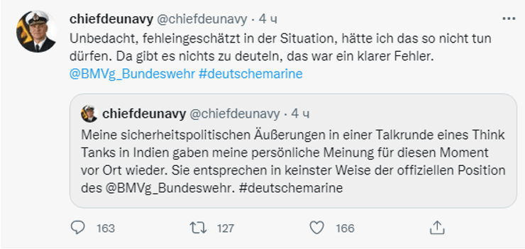 "Мої заяви про безпеку в індійському аналітичному центрі відображали особисту думку на той момент. Вони ніяк не відповідають офіційній позиції", — зазначив німецький військовий.