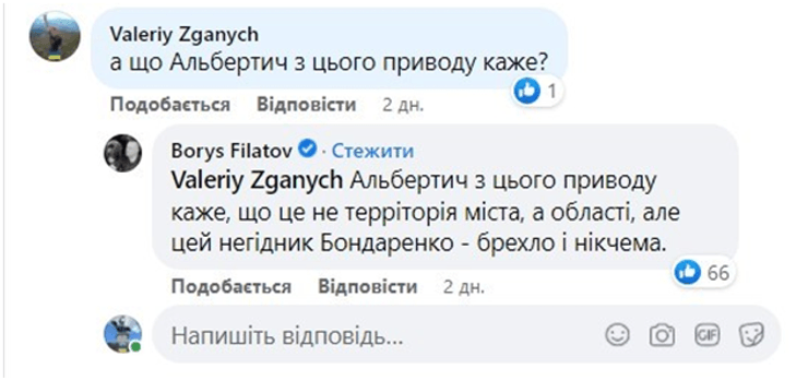 Міський голова Дніпра Борис Філатов на намагання колишнього очільника Дніпропетровської ОДА Олександра Бондаренка присвоїти собі чужі досягнення відреагував жорстко: "Цей негідник Бондаренко — брехло і нікчема", — написав він.