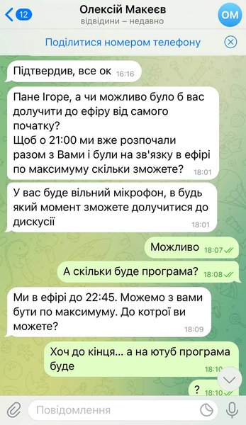 За словами екснардепа, телеканал запросив його по відеозв'язку взяти участь в ефірі програми "Презумпція провини", при цьому редактор, з яким обговорював це питання Мосійчук, пообіцяв, що політик зможе брати участь у дискусії протягом усієї програми. Як доказ політик опублікував скріншоти листування зі співробітником мовника.