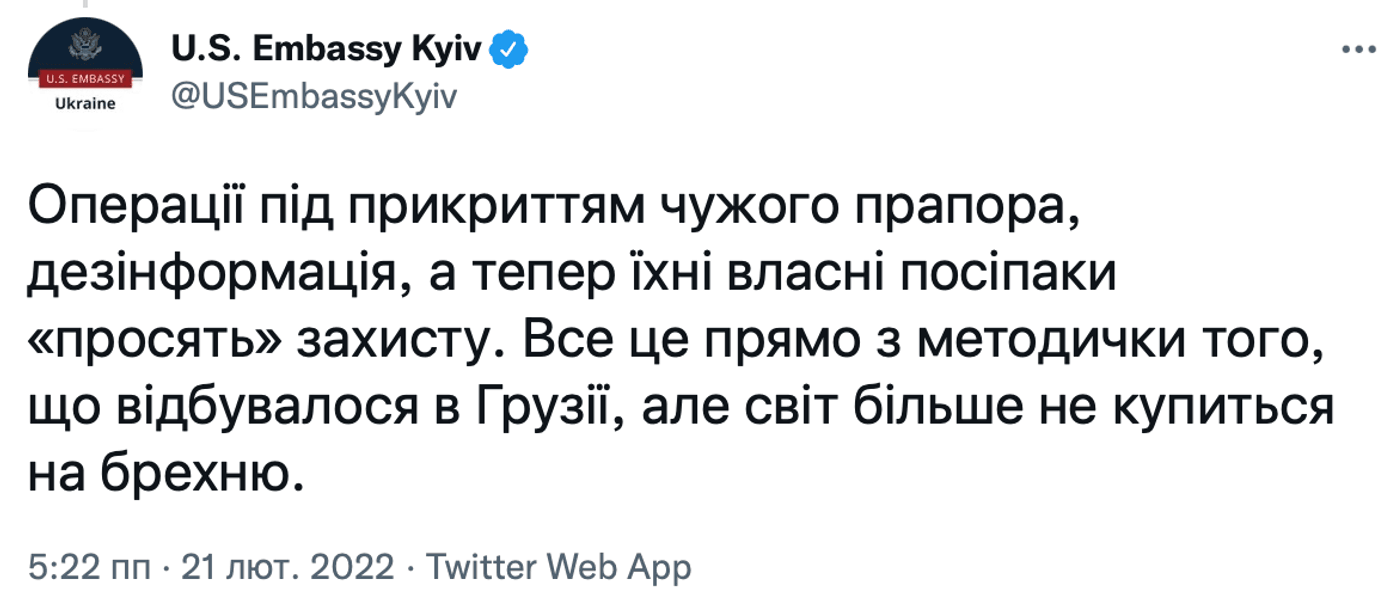 "Операції під прикриттям чужого прапора, дезінформація, а тепер їхні власні поплічники "просять" захисту. Усе це прямо з методички того, що відбувалося в Грузії, але світ більше не купиться на брехню", — заявили в посольстві.