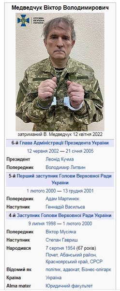 Нардепа зобразили як солдата армії РФ, який потрапив у полон, і розповідає, як приїхав в Україну "на військові навчання". А українська "Вікіпедія" у статті про Медведчука вже змінила його фотографію.