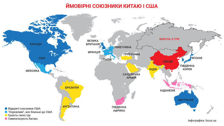 Однозначно з Пекіном зараз лише загнана в кут РФ. Водночас явно на боці Вашингтона майже половина учасників. При цьому, ті одиниці, яких можна вважати лояльними до КНР, скоріш "не довіряють" американцям, ніж відчувають якісь явні симпатії до Піднебесної. Також більшість країн, які лавірують, коли "запахне смаженим" оберуть Вашингтон. Європейські партнери продемонстрували це після початку великої війни на їхньому континенті.