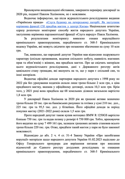 Офіційні доходи Халімона за період купівлі житла, а саме у 2021-2022 роках, склали 1,5 млн грн, проте нардеп також придбав мотоцикл MW R 1250GS вартістю близько 750 тис. грн та надав позику у розмірі 6 750 000 грн. Таким чином, враховуючи витрати парламентарію на суму 7 499 161 грн, залишок грошових активів становив лише трохи більше 220 тис. грн, зазначили в агентстві. Таким чином, придбати житло у пари офіційно не було можливості, вважають у НАЗК. Відповідну інформацію вже було передано до Офісу генерального прокурора для внесення даних до Єдиного реєстру досудових розслідувань за ст. 368-5 Кримінального кодексу (незаконне збагачення).