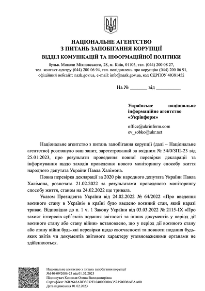 При цьому в НАЗК наголосили, що повністю перевірити декларації Халімона за 2020 рік неможливо через законодавство про воєнний стан.