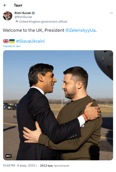 Прем'єр-міністр Великобританії Ріші Сунак у своєму офіційному акаунті у Twitter привітав Зеленського й опублікував фото зустрічі з українським президентом.