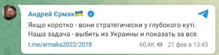 "Якщо коротко — вони в глухому куті. Наше завдання їх вибити з України і покарати за все", — написав Єрмак.