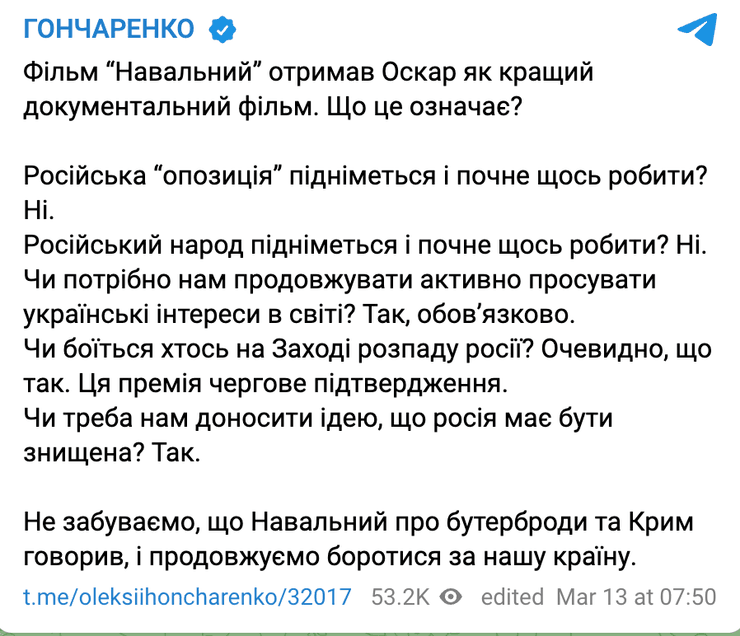 "Якщо Оскар поза політикою, як тоді розуміти документальний маніфест "Навальний", у якому внутрішньоросійська політика ллється через край? Якщо Оскар поза контекстом війни в Україні та масовим геноцидом українців, навіщо тоді постійно говорити про гуманізм і справедливість?" — Висловився радник голови ОП.
