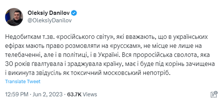 Секретар Ради національної безпеки та оборони України Олексій Данілов відреагував на дискусію. Він заявив, що "недобиткам так званого "російського миру", які вважають, що в українських ефірах можуть розмовляти російською, не місце на телебаченні, в політиці та в Україні".