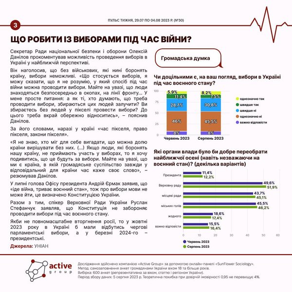 Більшість українців висловилися проти проведення виборів восени 2023 року в умовах війни з Росією. Про це свідчать дані соціологічного опитування компанії Active Group, опубліковані 7 серпня.