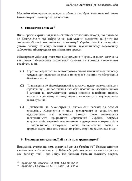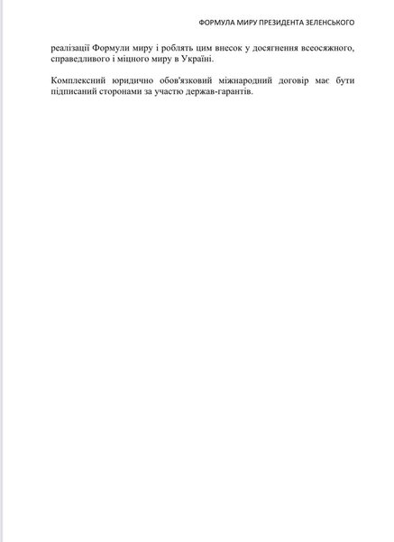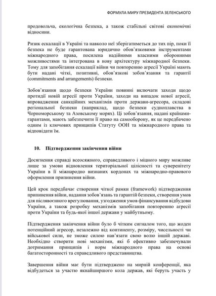 Після закінчення воєнних дій буде ухвалено міжнародний документ, який зафіксує завершення конфлікту й перемогу України. Передбачається, що цей документ буде затверджено на Глобальному мирному саміті, на який зберуться всі країни, що беруть участь у процесі, і який закріплюватиме виконання десятого пункту "формули" — досягнення миру можливе лише шляхом повного звільнення територій України.