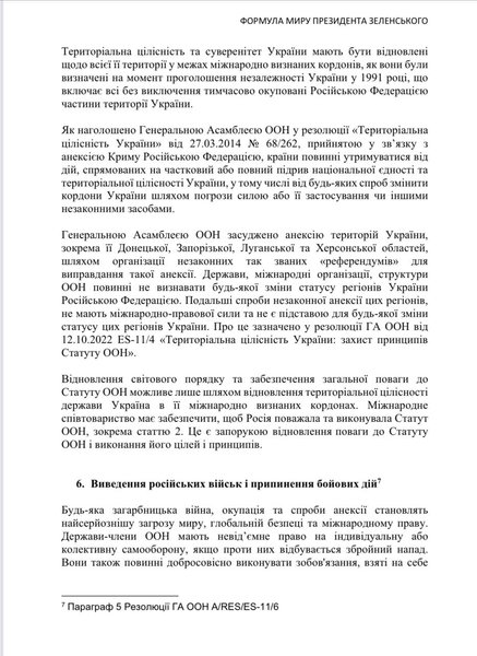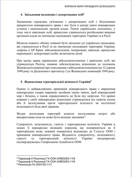 Як зазначив глава Офісу президента Андрій Єрмак, ці принципи ґрунтуються на ключових нормах Статуту ООН і міжнародного права, а також на повазі до суверенітету й територіальної цілісності держав у межах визнаних міжнародних кордонів.