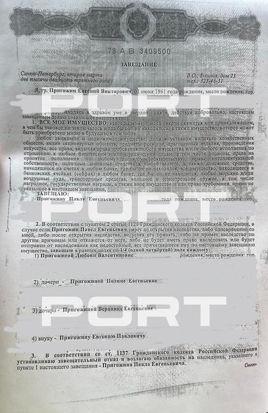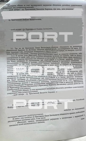 У заповіті йдеться про те, що в разі смерті Павла, відмови від спадщини або інших обставин, спадок порівну розділиться між вдовою Пригожина Любов'ю Кряжевою, його повнолітніми доньками, а також онуком Євгеном Пригожиним 2021 року народження. Якщо у спадок вступлять дочки — їм доведеться утримувати матір Пригожина. Дружина в такому разі в заповіті не згадується.