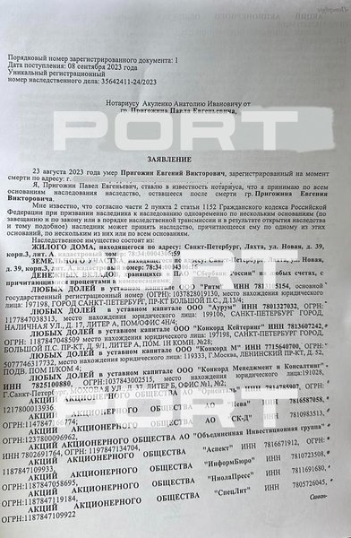 За підрахунками ЗМІ, якщо скласти доходи всіх компаній Пригожина і вартість нерухомості, вийде близько 12 млрд рублів. Згідно із заповітом, син має забезпечити вдову Пригожина, а також його дочок і матір. Однак 25-річний Павло, за інформацією журналістів, не має наміру ділитися.