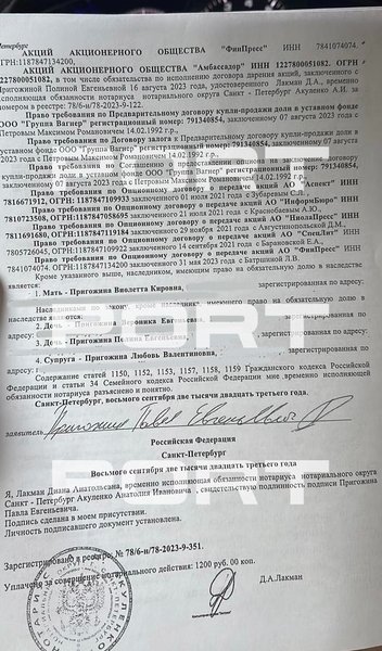 Усе майно глави ПВК "Вагнер" Євгена Пригожина, який загинув в авіакатастрофі, дістанеться його синові — 25-річному Павлу Пригожину. 8 вересня 2023 року він вступив у спадок. Заповіт Пригожина опублікували у виданні Port.