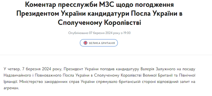 За інформацією Міністерства закордонних справ, до Британії вже подано запит на попередню згоду з кандидатурою Залужного.