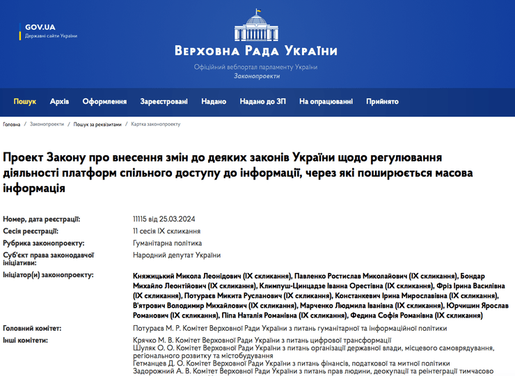 У понеділок, 25 березня, у Верховній Раді зареєстровано законопроєкт №11115 про "регулювання діяльності платформ спільного доступу до інформації, через які поширюється масова інформація". Картка цього документа з’явилася на офіційному вебпорталі парламенту.