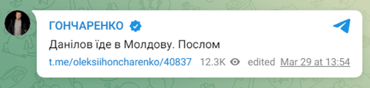 Колишнього секретаря Ради національної безпеки і оборони Олексія Данілова буде призначено послом України в Республіці Молдова. Про це 29 березня повідомив народний депутат України від фракції "Європейська солідарність" Олексій Гончаренко у своєму Telegram-каналі.