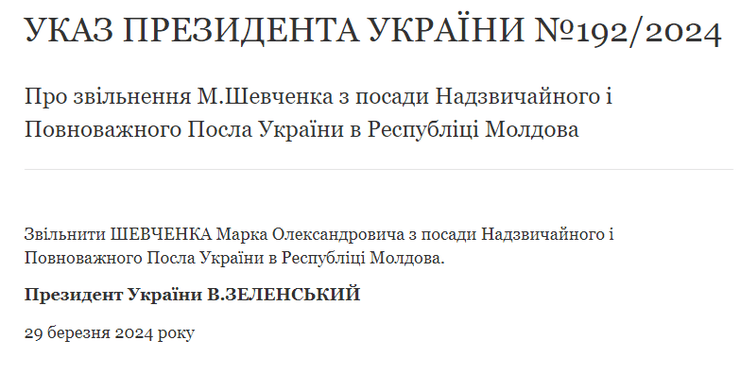 Зазначимо, що указом президента України Володимира Зеленського №192/2024 Марко Шевченко звільнений з посади Надзвичайного і Повноважного Посла України в Республіці Молдова.