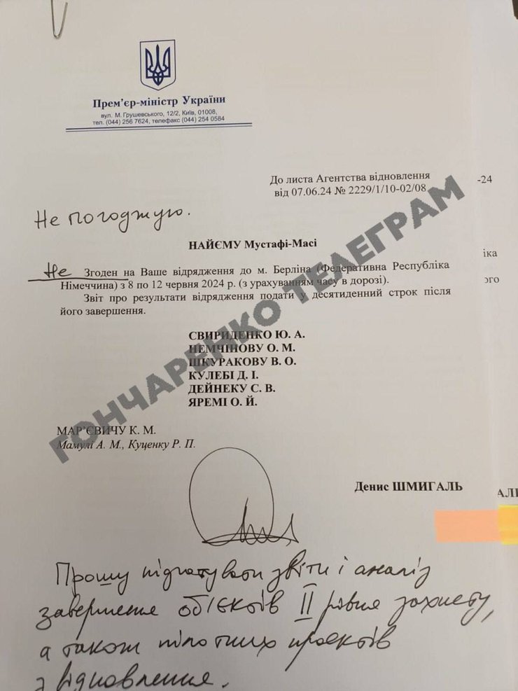 Народний депутат від фракції "Європейська Солідарність" Олексій Гончаренко у своєму Telegram-каналі оприлюднив відповідь Шмигаля Найєму. У документі керівник Уряду спочатку дав згоду на відрядження, але потім ручкою дописав "Не" перед "згоден" і попросив підготувати аналіз завершення обʼєктів 2 рівня захисту, а також пілотних проєктів з відновлення.