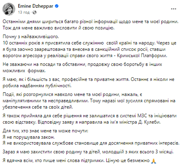 "Відповідну заяву я направила на імʼя міністра Д. Кулеби", — написала Джапарова.