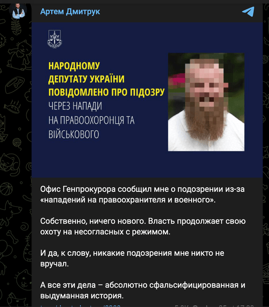 Народному депутату України Артему Дмитруку повідомили про підозру за напад на правоохоронця та військового. Про це розповіли в Офісі Генерального прокурора.