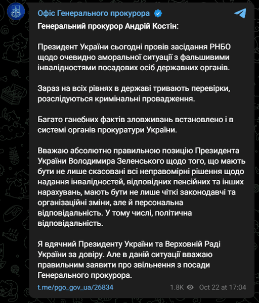 "Багато ганебних фактів зловживань встановлено і в системі органів прокуратури України. Вважаю абсолютно правильною позицію президента України Володимира Зеленського стосовно того, що мають бути не лише скасовані всі неправомірні рішення щодо надання інвалідності, відповідних пенсійних та інших нарахувань, мають бути не лише чіткі законодавчі та організаційні зміни, а й персональна відповідальність. Зокрема політична відповідальність", — йдеться у зверненні Костіна.