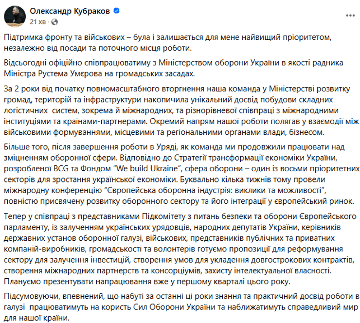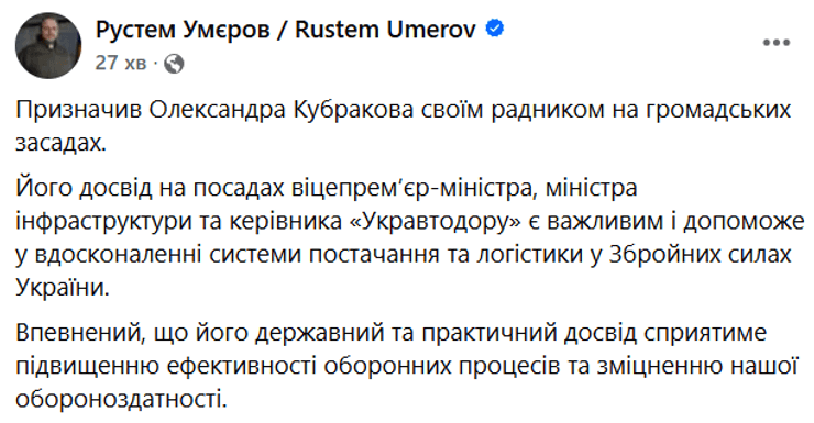 Міністр оборони України Рустем Умєров призначив ексвіцепрем’єр-міністра, міністра інфраструктури та колишнього керівника "Укравтодору" Олександра Кубракова своїм радником на громадських засадах. Про це очільник оборонного відомства повідомив в Facebook у вівторок, 7 січня.