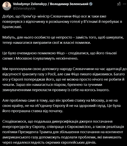 Словацький прем'єр хоче обговорити питання про припинення транзиту російського газу. Він заявив, що має "іншу думку" щодо цього рішення. Президент Володимир Зеленський поки не відреагував на публічне звернення Фіцо.