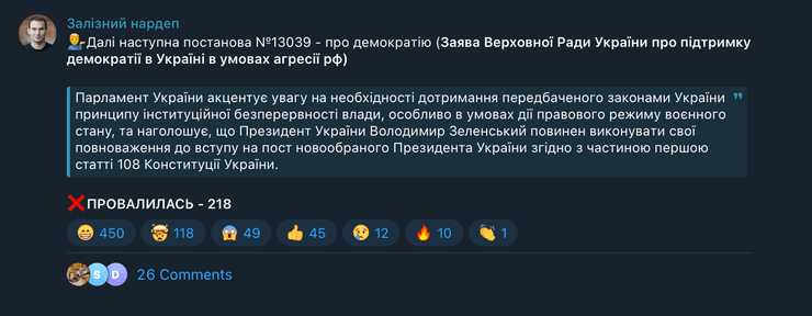 Нардепи не змогли підтримати необхідними 226 голосами (проголосували 218) постанову щодо заяву "про підтримку демократії в Україні в умовах агресії РФ", у якій йшлося про те, що парламент оголосить вибори президента після того, як на території Україні "буде забезпечено всеохоплюючий, справедливий і сталий мир".