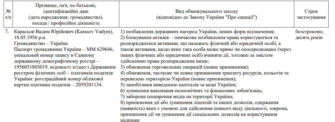 Примітно, що Вадима Карасьова двічі внесли до санкційного списку.