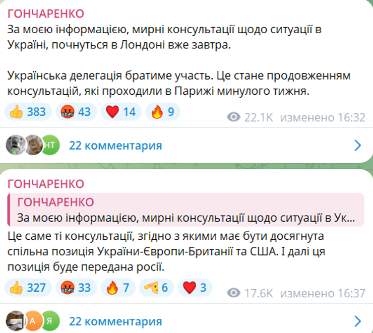 Про чергову зустріч переговірників повідомив у Telegram народний депутат Олексій Гончаренко, посилаючись на інформовані джерела.