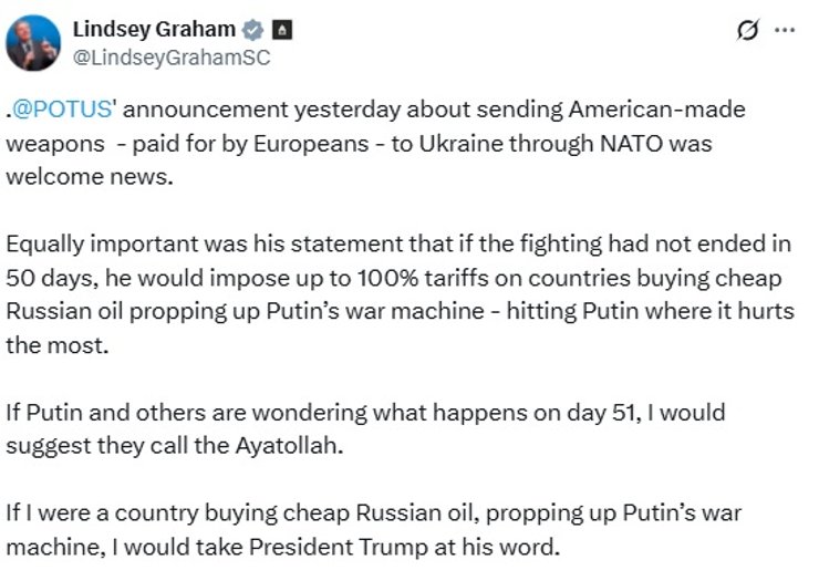 Він нагадав, що якщо бойові дії не припиняться за 50 днів, президент США запровадить мита до 100% для країн, які купують дешеву російську нафту і підтримують військову машину Путіна, що вдарить по його найболючішому місцю.