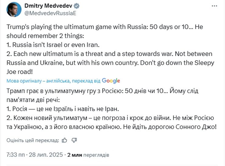 "50 днів чи 10... Йому варто пам'ятати дві речі: 1. Росія — це не Ізраїль і навіть не Іран. 2. Кожен новий ультиматум — це загроза і крок до війни. Не між Росією та Україною, а з його власною країною. Не йдіть шляхом Сонного Джо!" — написав Медведєв.