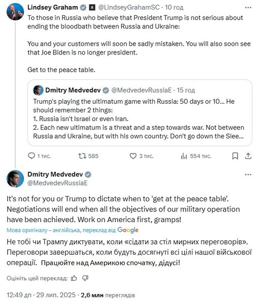 На цей пост третього президента Росії сенатор Ліндсі Грем відреагував повідомленням, зверненим до тих у Росії, хто вважає, що президент Трамп не налаштований серйозно покласти край кровопролиттю між Росією та Україною.