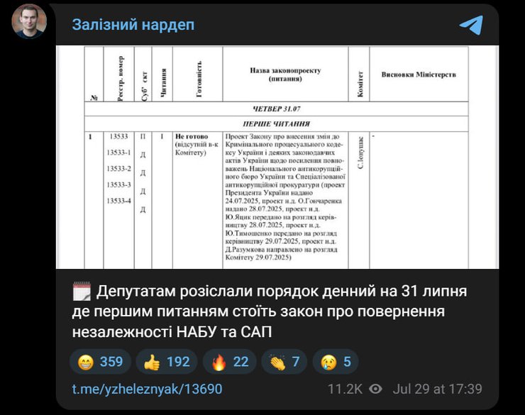 Як написав у своєму Telegram-каналі депутат партії "Голос" Ярослав Железняк, народним депутатам вже надіслали порядок денний, де саме президентський законопроєкт про НАБУ та САП значиться першим питанням.