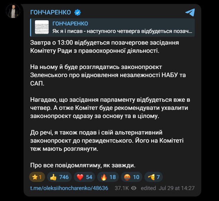 Цю інформацію підтвердив також народний депутат та член фракції "Європейська солідарність" Олексій Гончаренко. У своєму Telegram-каналі він зазначив, що засідання відбудеться 31 липня о 13:00, і саме на ньому розглядатиметься проєкт Володимира Зеленського.