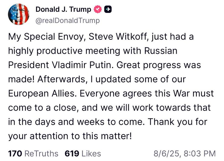"Після цього я поінформував деяких наших європейських союзників. Усі згодні, що ця війна має закінчитися, і ми працюватимемо над цим найближчими днями та тижнями. Дякую за вашу увагу цьому питанню!" — ідеться в повідомленні Трампа в Truth Social.