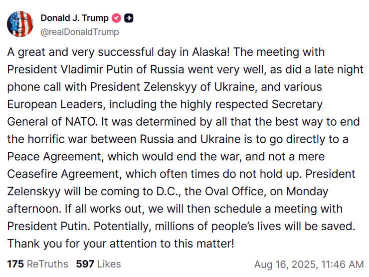 Зустріч із президентом Росії Володимиром Путіним на Алясці, як і нічна телефонна розмова з президентом України Володимиром Зеленським та різними європейськими лідерами, включно з генеральним секретарем НАТО Марком Рютте, відбулися добре, вважає глава Білого дому.