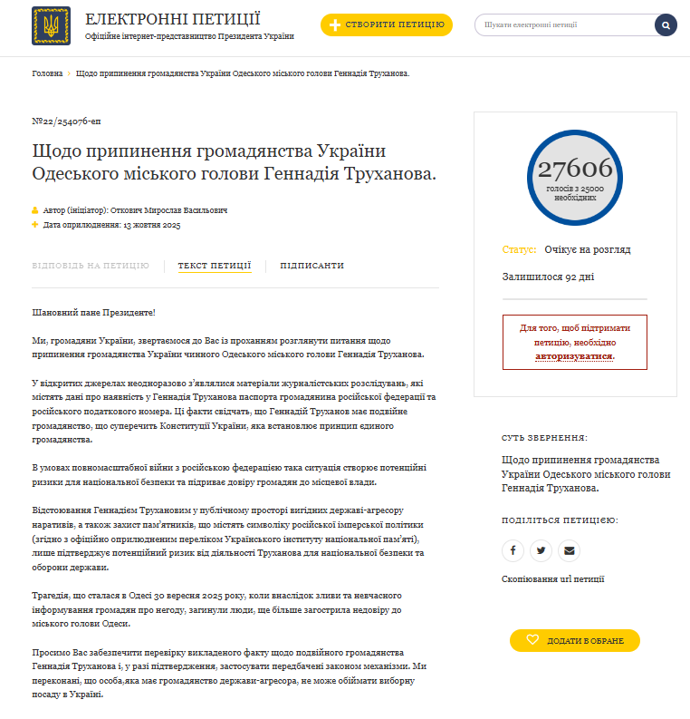Тим часом офіцер ЗСУ Мирослав Откович 13 жовтня зареєстрував петицію із закликом позбавити громадянства України міського голову Одеси Геннадія Труханова. Уже 14 жовтня вона набрала 27606 голосів із 25 тисяч мінімально необхідних для розгляду президентом.