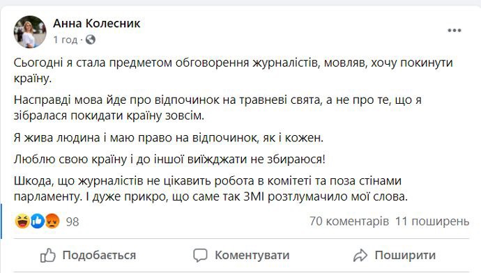 За словами спікерки фракції "Слуга народу" Юлії Палійчук, місце Колесник посяде Дмитро Слинько, оскільки кандидати вище у списку Юлія Полійчук і Володимир Тригуб відмовилися від посади.