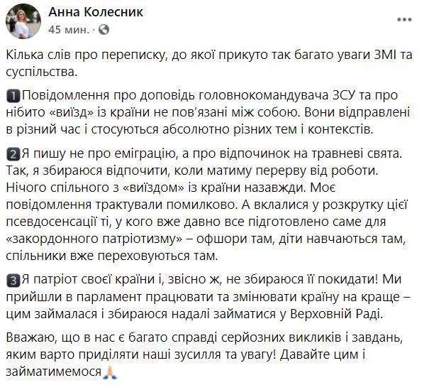 У березні 2021 року вона потрапила в неприємну ситуацію через листування. Під час виступу на позачерговому засіданні Верховної Ради тодішнього головнокомандувача ЗСУ Руслана Хомчака, який розповів, що Росія стягує війська до кордону з Україною, вона писала своїм знайомим, що "треба звалювати з цієї країни".