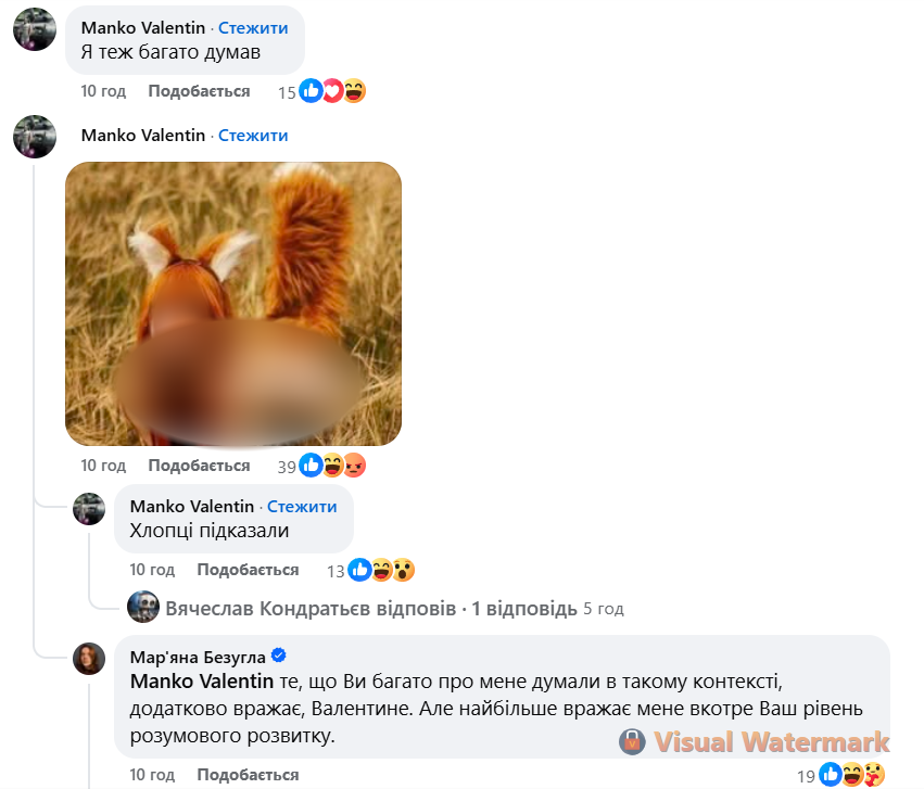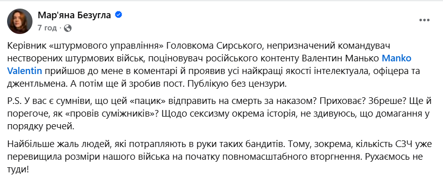 "Отже, керівник "штурмового управління" головкома Сирського, непризначений командувач нестворених штурмових військ, поціновувач російського контенту Валентин Манько прийшов до мене в коментарі й проявив усі найкращі якості інтелектуала, офіцера та джентльмена. А потім ще й зробив пост", — розповіла Безугла.