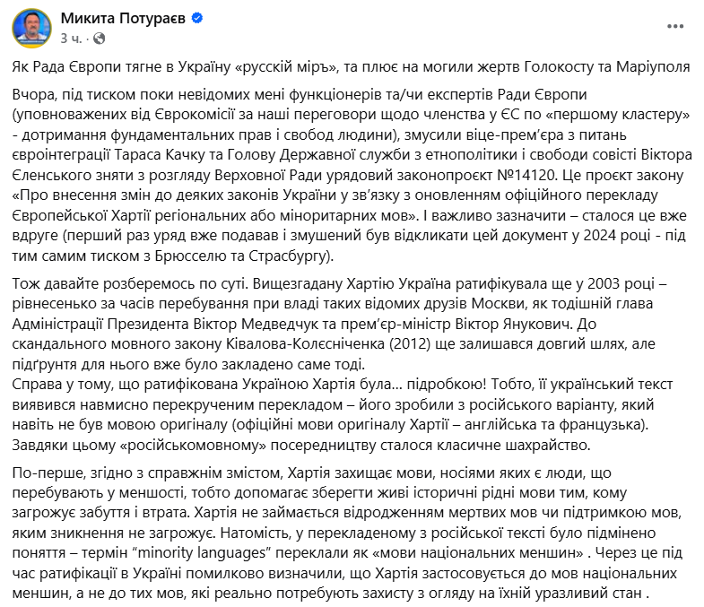 Потураєв наголошує, що Хартію, про яку йдеться, Україна ратифікувала ще 2003 року, однак цей документ був підробкою, оскільки в нього нібито був "навмисно перекручений переклад".