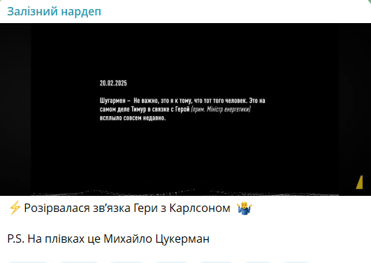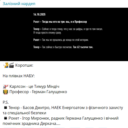 Раніше нардеп від "Голосу" Ярослав Железняк вніс ясність і пояснив, що "Карлсон" — Тимур Міндіч, "Професор" — екс-міністр енергетики, а зараз міністр юстиції Герман Галущенко", "Тенор" — Дмитро Басов, виконавчий директор з фізичного захисту та безпеки АТ НАЕК "Енергоатом", а "Рокет" — Ігор Миронюк, радник Германа Галущенка і помічник колишнього нардепа Андрія Деркача, який зараз є сенатором Архангельської області РФ.