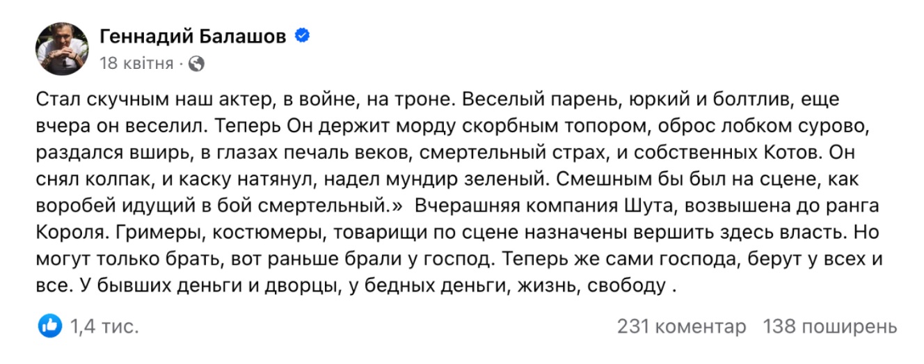 Загалом Балашов багато критикував Володимира Зеленського. Наприклад, у цьому ж відео він каже, що війна — це продовження влади Зеленського, тому він буде постійно "тримати країну у воєнному стані".